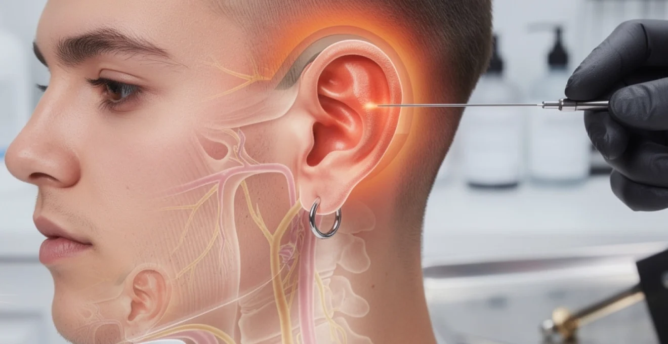 Cette innervation est également responsable des phénomènes de douleur projetée, lorsque la sensation ne se limite pas strictement au point de perçage, mais irradie vers le pavillon, la mâchoire ou la région temporale. Certains patients décrivent ainsi une impression de « tiraillement » ou de douleur diffuse autour de l’oreille dans les heures qui suivent l’acte. Néanmoins, cette hyper-sensibilité reste généralement transitoire et diminue à mesure que l’inflammation aiguë s’estompe et que le processus de cicatrisation se stabilise.